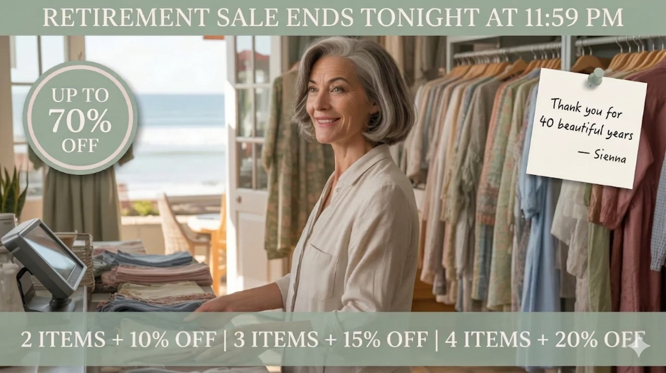 For over 40 years, designing for women has been one of the greatest joys of my life. What began as a small dream slowly grew into a beautiful journey shared with thousands of wonderful women. But the moment has come sooner than I ever expected. Due to the challenges of this past year, I’ve made the difficult decision to retire earlier than planned — and close my boutique for good.